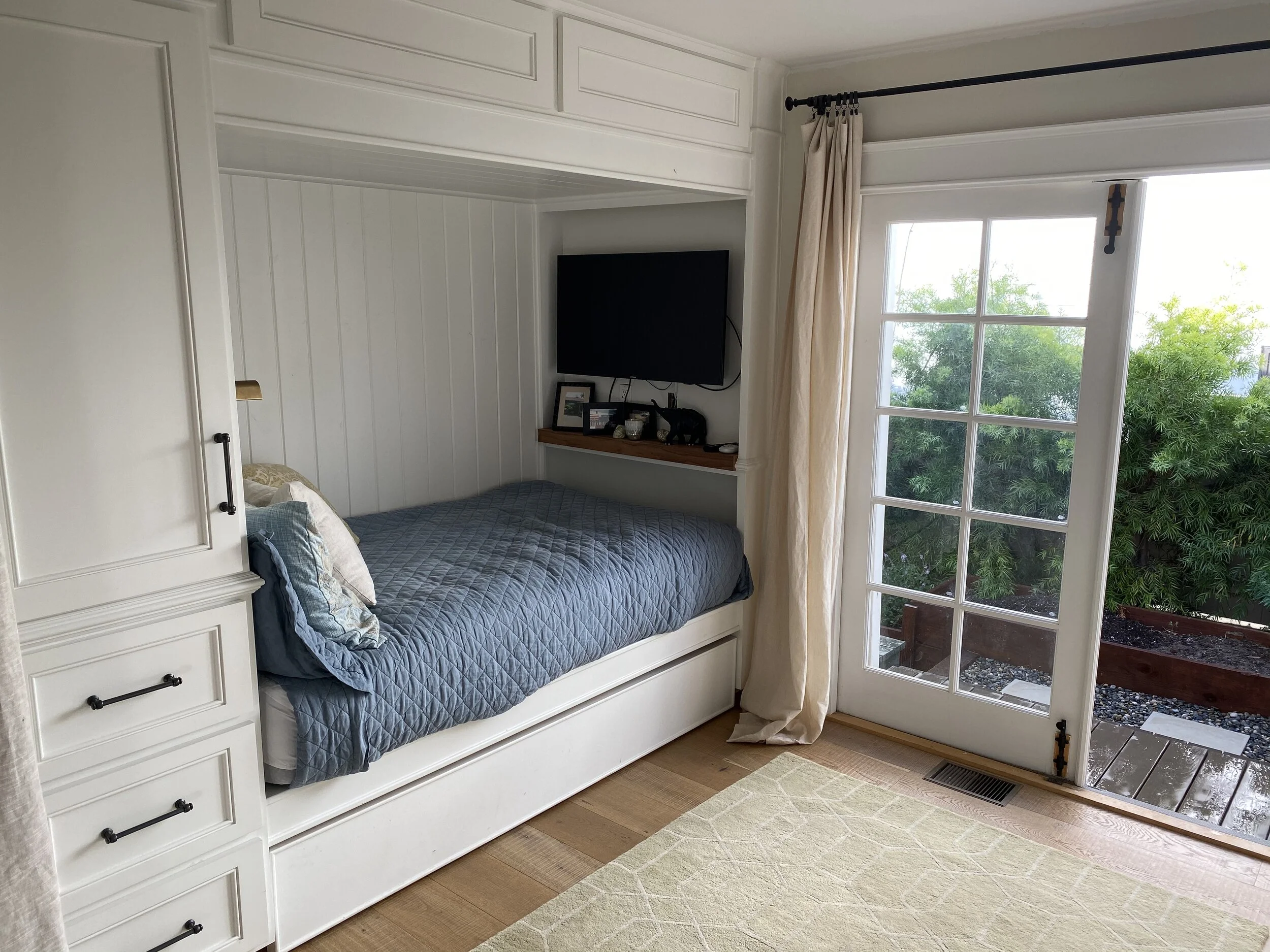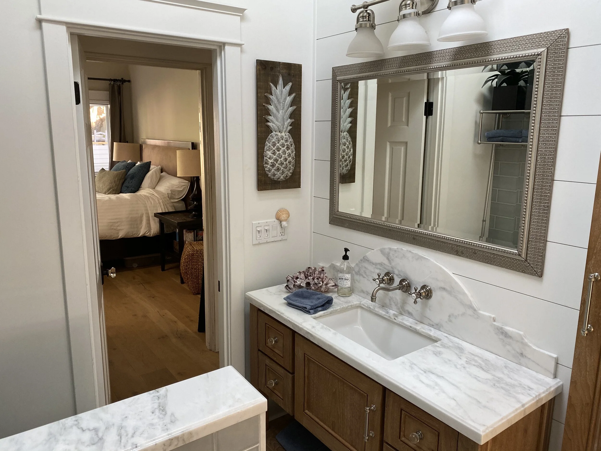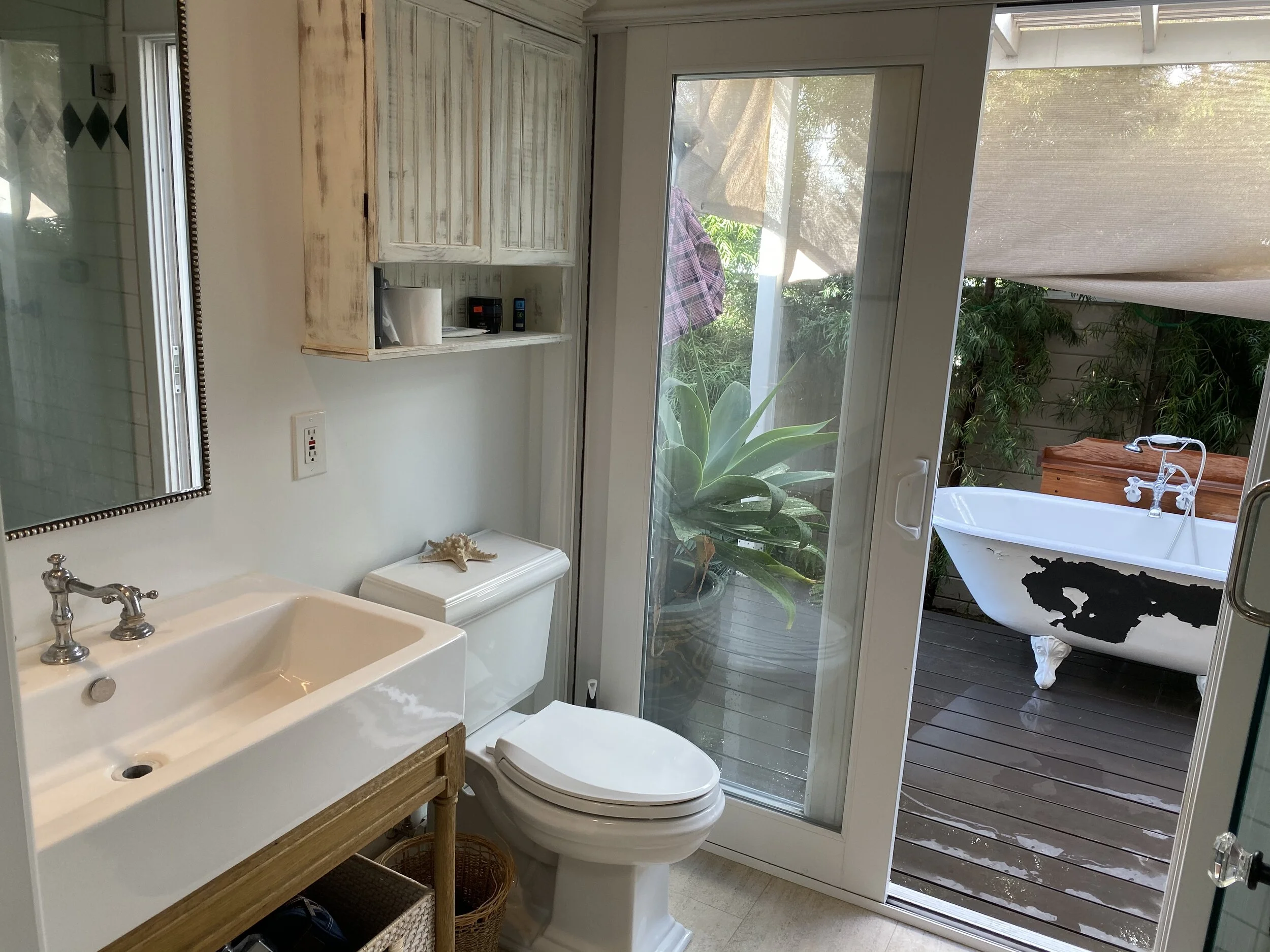 This is my own renovation. I purchased this home from a friend of a friend who said that he was about to sell to a developer to tear down - he said it had a nice view and a tiki bar- that was all it took for a look-see. It will be turning 100 years old soon so it needed some work. I fell in love with its character despite some layout issues like it had the sink, range and refrigerator all in adjacent but different rooms. Because it is a small house I opened up walls to create defined but shared spaces that make it feel bigger - from the dining room you can see the full width and length of the home. To increase natural light, I raised the ceiling with new skylights and added large french doors that lead out to a new garden. It is important to design for the way you want to live and this house fits my barefoot lifestyle.